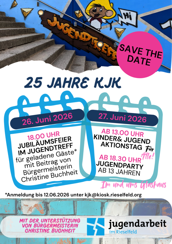 2026 feiert das KJK sein 25-jähriges Jubiläum. Wir laden alle Interessierten, Kooperationspartner*innen, ehemalige Besucher*innen und Wegbegleiter*innen herzlich ein: Freitag, 26.06.2026: KJK für interessierte Erwachsene und Samstag, 27.06.2026: Aktionstag für Kinder & Jugendliche. Wir freuen uns aufs gemeinsame Feiern!