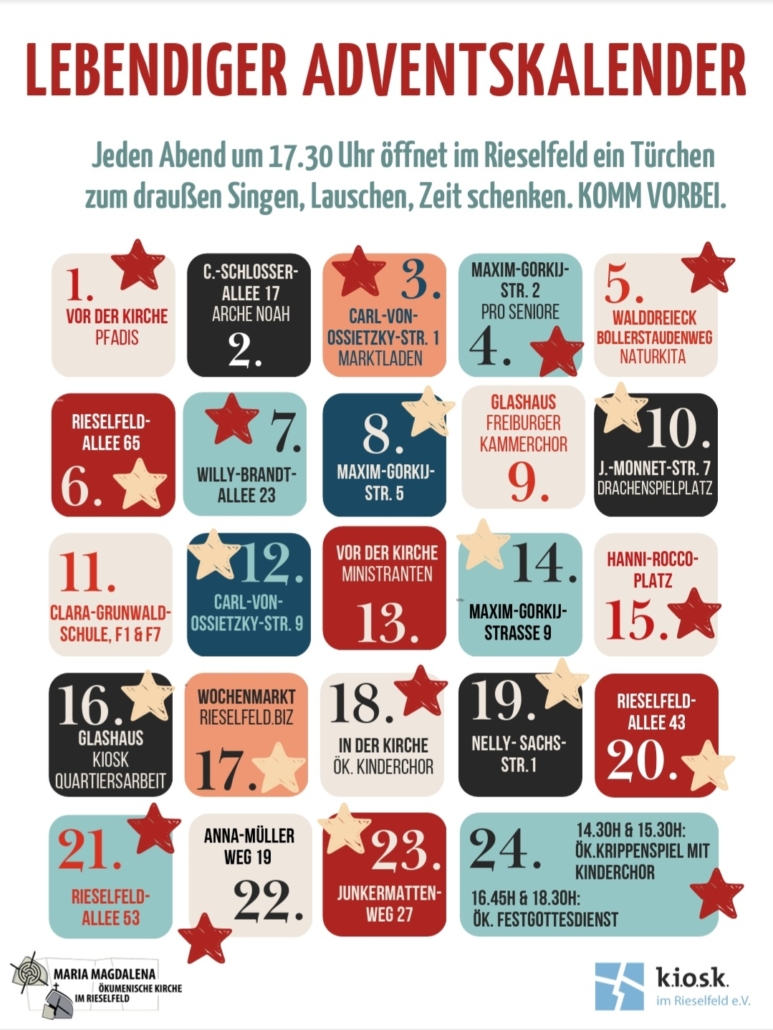 Wie schön ist es, zusammen ein Licht anzuzünden, gemeinsam eine Geschichte und Lieder zu teilen?! Organisiert von der ökumenischen Kirche im Rieselfeld und K.I.O.S.K. beginnt am 01. Dezember der lebendige Adventskalender. Jeden Abend um 17:30 Uhr leuchtet bis einschließlich 23. Dezember an einer anderen Stelle im Rieselfeld ein Fenster und es gibt eine kleine Adventszeit zusammen. Die jeweilige Adresse findet man oben im Plakat, über die Aushänge an Kirche und Glashaus und im Gemeindeblatt der Kirche für die Weihnachtszeit. Seid alle herzlich willkommen!
