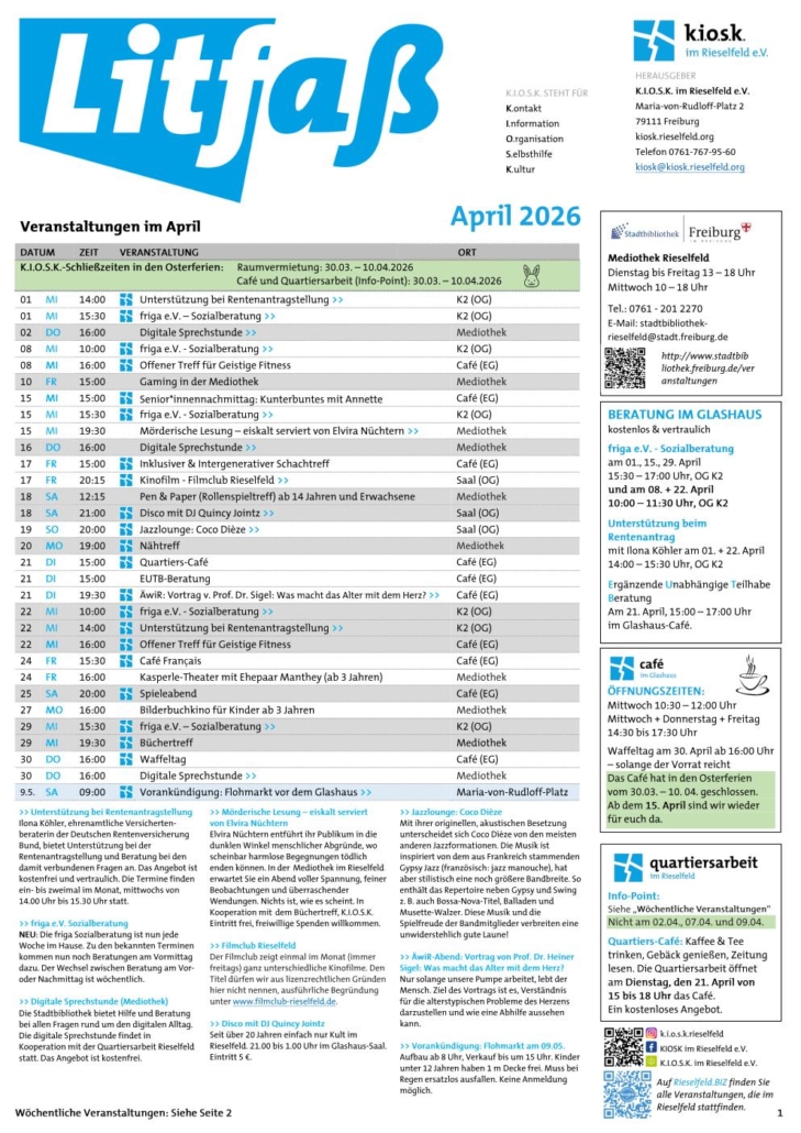 Unter kiosk.­­rieselfeld.­­org/aktuelles-veranstal­tungs­programm/ ist das aktuelle Litfaß zu finden!
