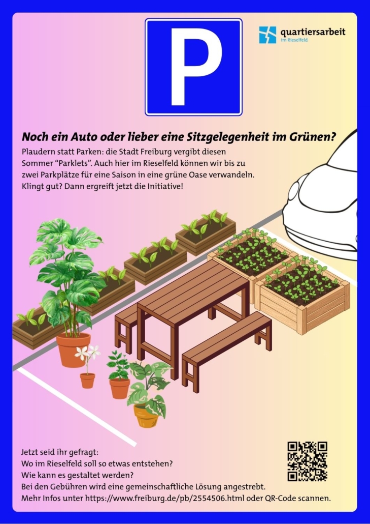Plaudern statt Parken: die Stadt Freiburg vergibt diesen Sommer „Parklets“. Auch hier im Rieselfeld können wir bis zu zwei Pakrplätzr für eine Saison in eine grüme Oase verwandeln. Klingt gut? Dann ergreift jetzt die Initiative!
