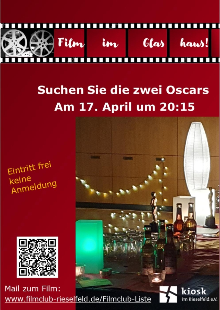 Im großen Saal (OG) im Glashaus läuft am 17. April ein neuer Film, gezeigt vom Rieselfelder Filmclub. Welcher Titel? Das steht an der Infowand im Glashaus, da wir den Filmtitel nur am Veranstaltungsort ankündigen dürfen.