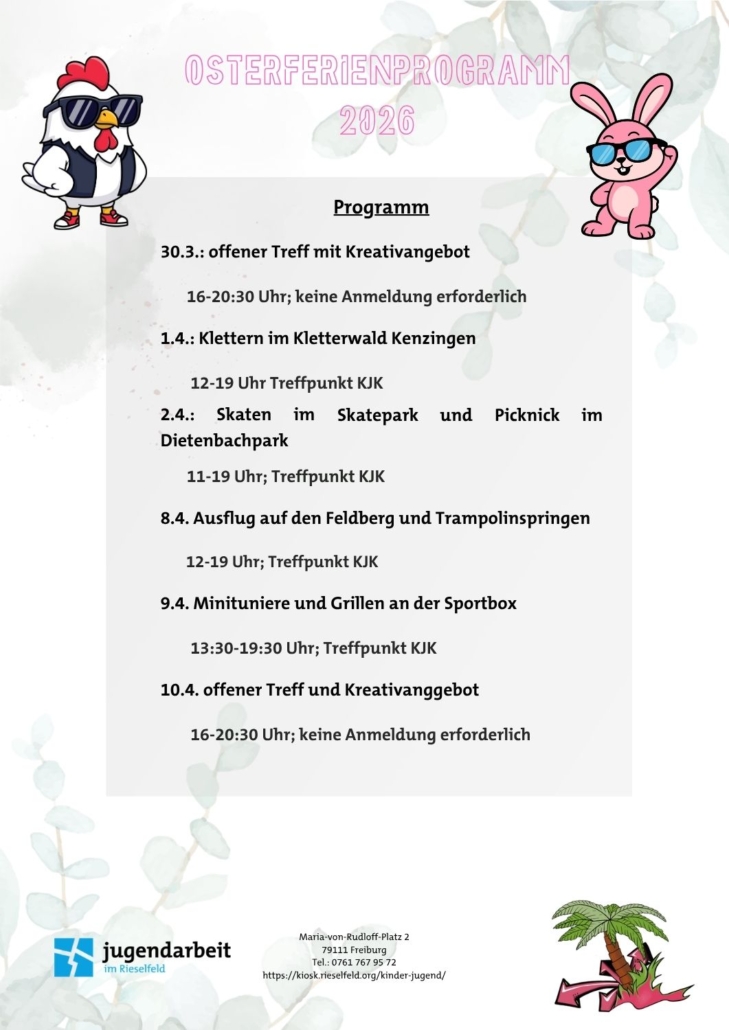 In den Ferien 2026 hat der Kinder- und Jugendtreff montags von 16.00 bis 20:30 Uhr offen und freitags von 15:00 bis 21:00 Uhr offen. Hier können alle Kinder, Jugendliche und junge Erwachsene ohne Anmeldung und kostenlos vorbeikommen.