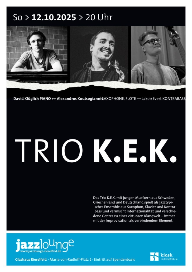 Das Trios K.E.K. mit jungen Musikern aus Schweden, Griechenland und Deutschland spielt als jazztypisches Ensemble aus Saxophon, Klavier und Kontrabass und vermischt Internationalität und verschiedene Genres virtuos zu einer einheitlichen Klangwelt – immer mit der Improvisation als verbindendem Element.