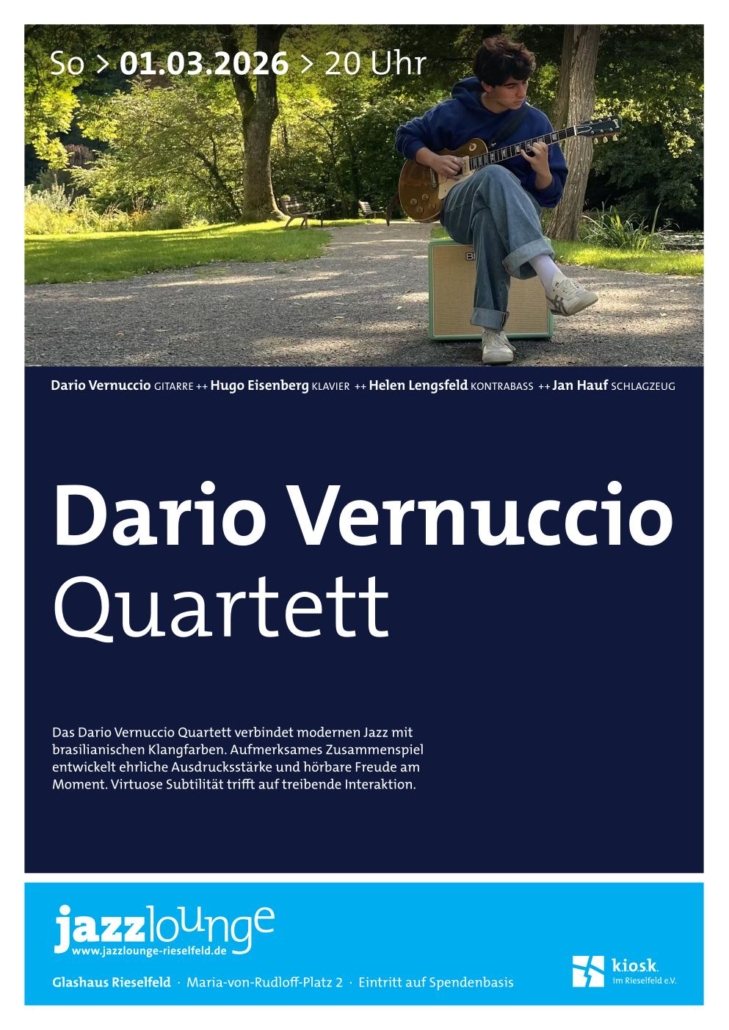 Das Dario Vernuccio Quartett verbindet modernen Jazz mit brasilianischen Klangfarben: Offenheit, Vertrauen und aufmerksames Zusammenspiel entwickeln ehrliche Ausdrucksstärke und die hör- und erlebbare Freude am Moment. Virtuose Subtilität trifft auf treibender Interaktion.