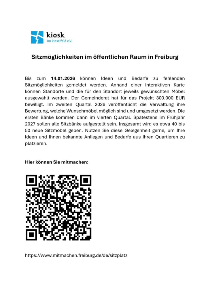 Fehlende Sitzmöglichkeiten im Rieselfeld bis 14.01.26 melden